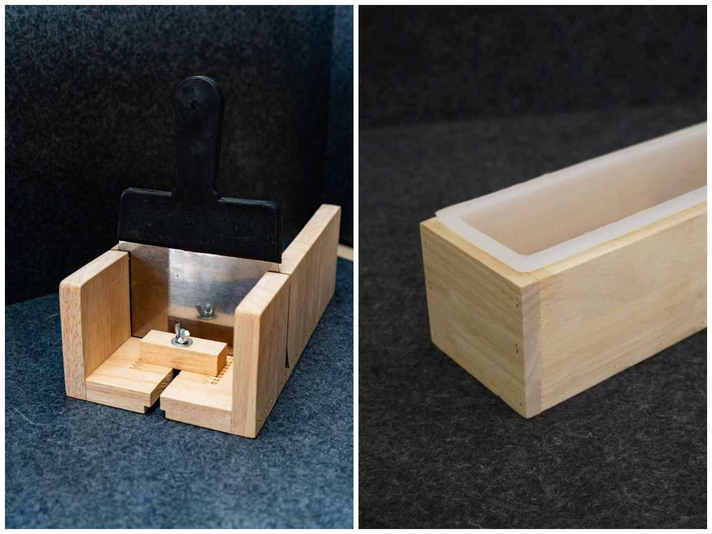 Wooden box holds the silicone mold in shape for even, consistent soaps